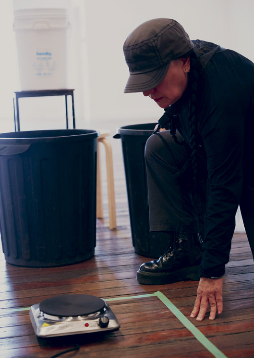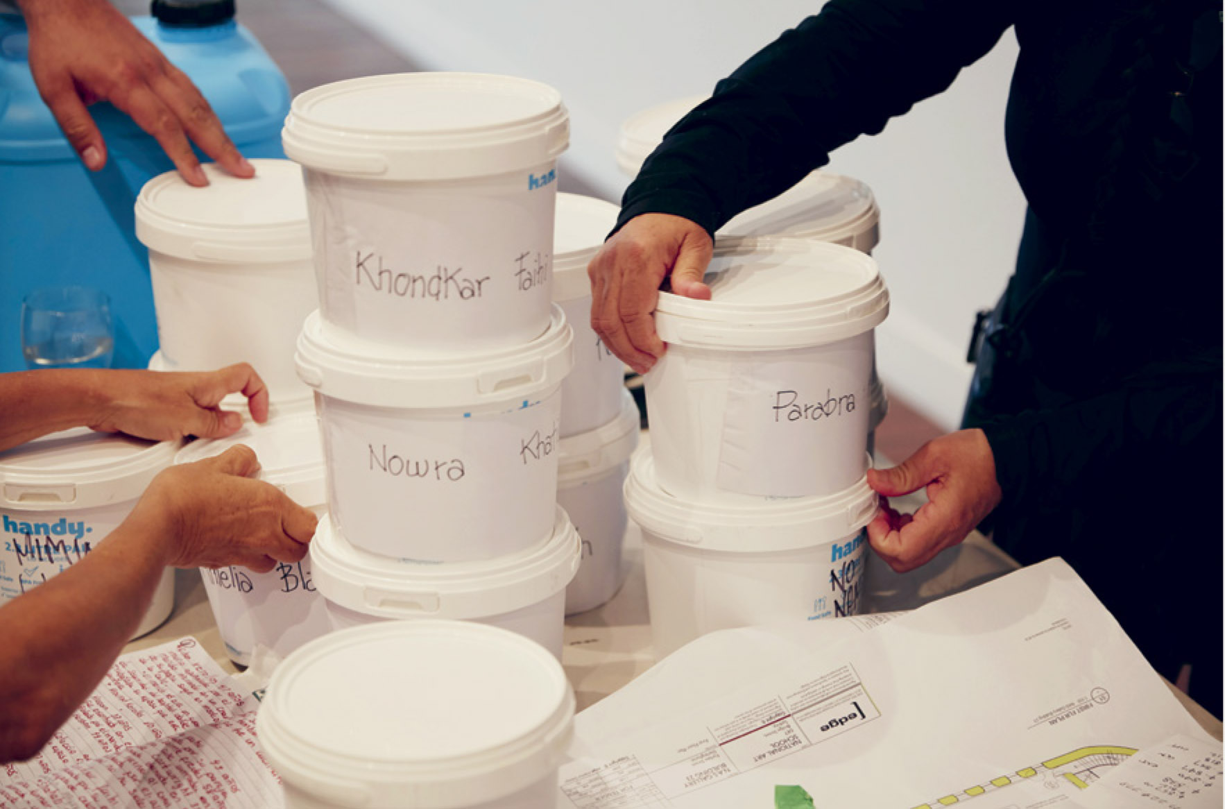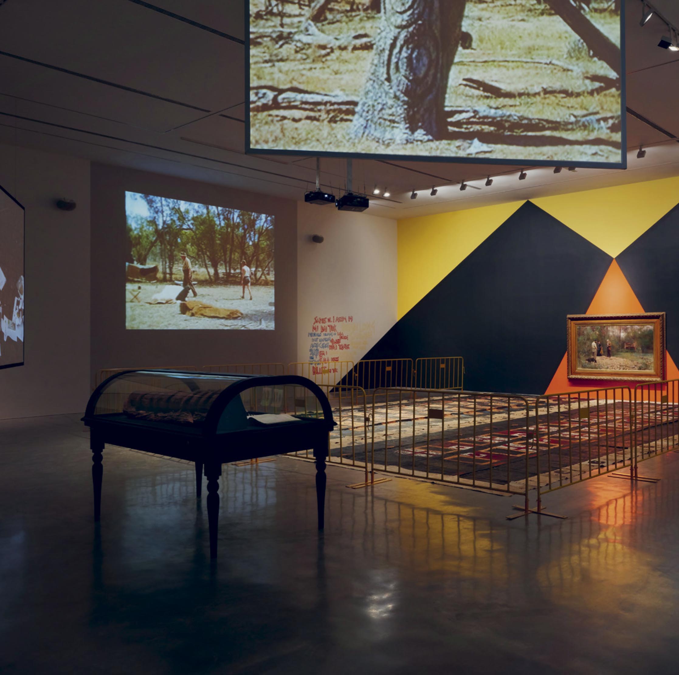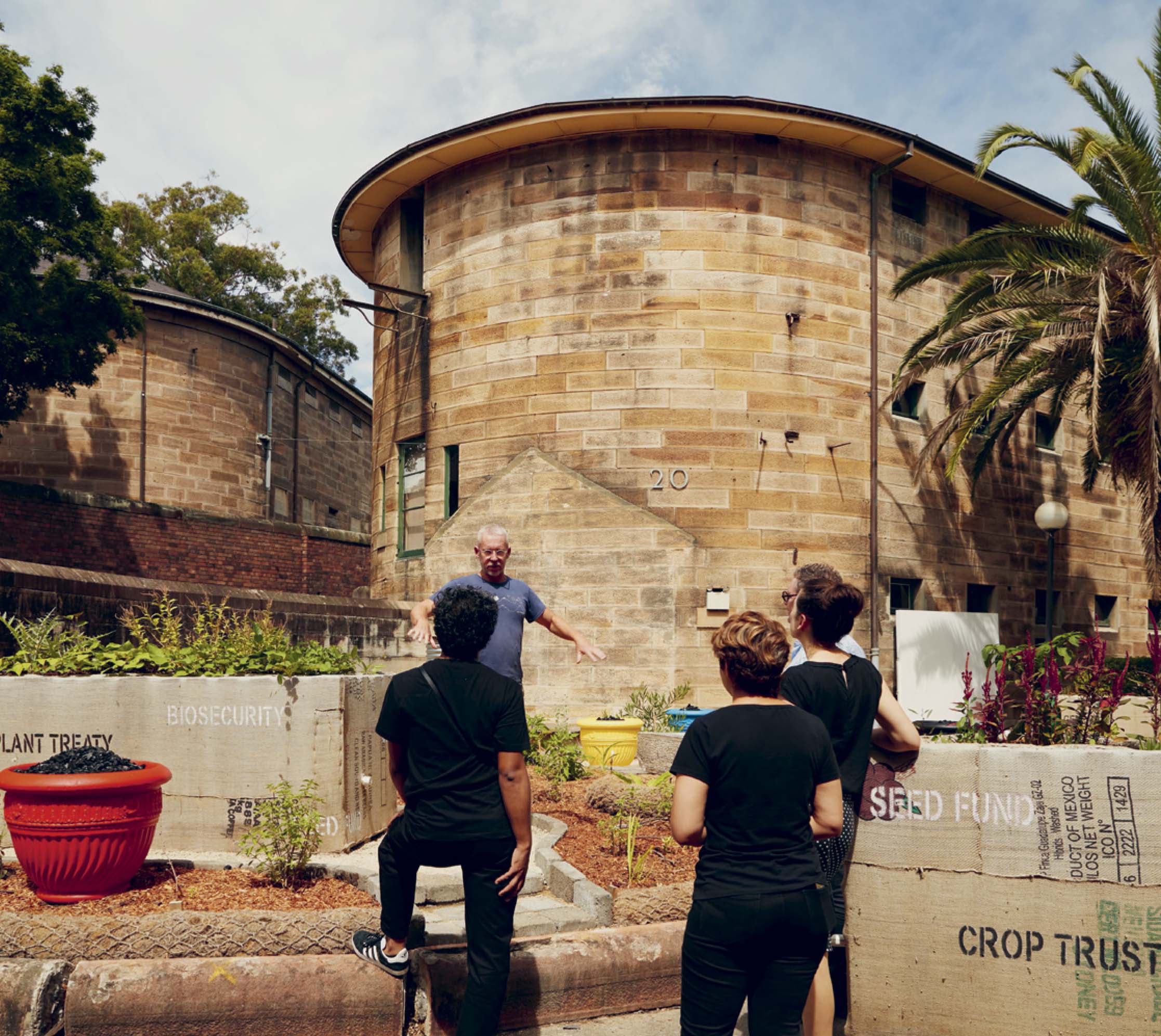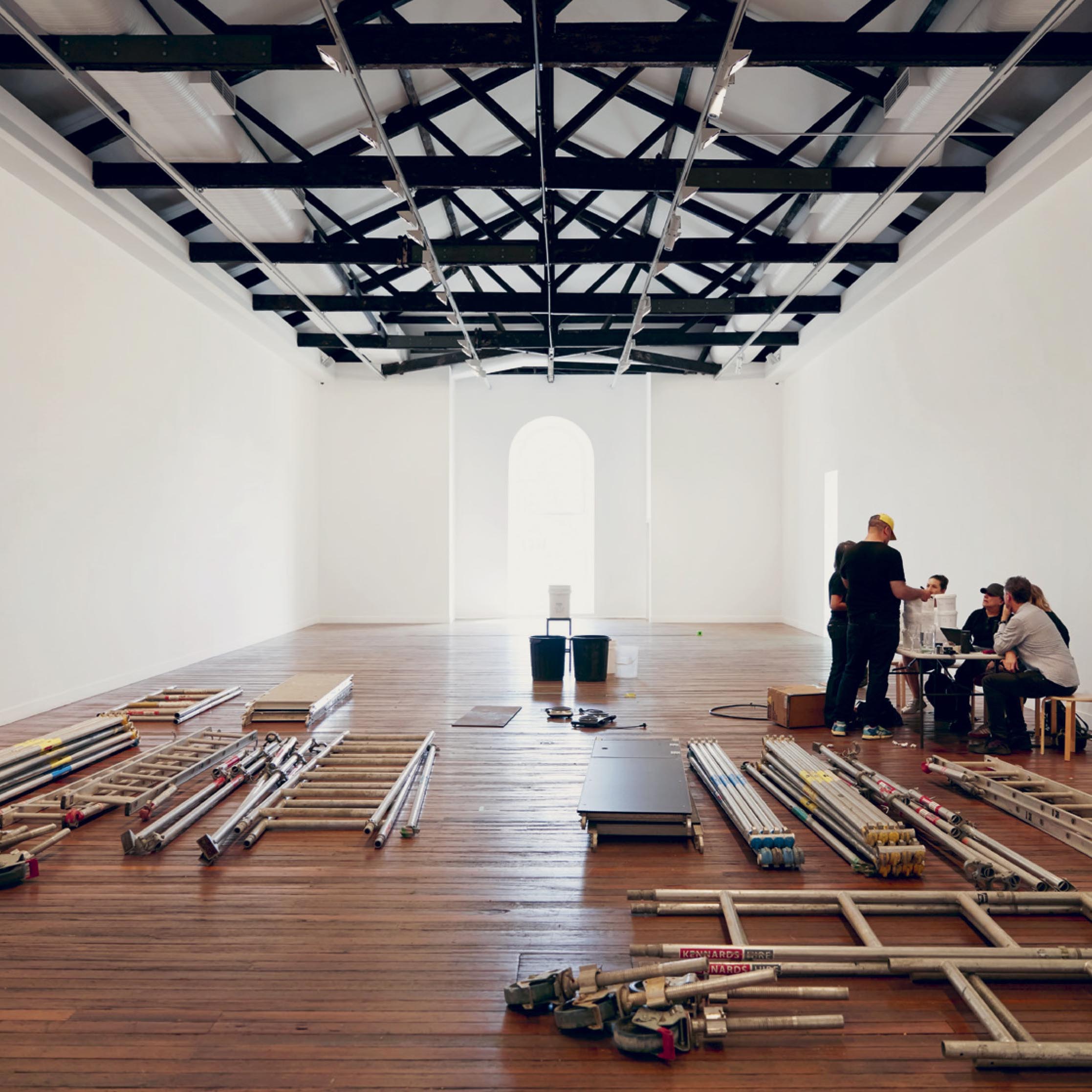 ↗ Eric Bridgeman and Haus Yuriyal, SUNNA (Middle Ground), 2020, multimediainstallation, round house, picture house, painting, billum weaving, photography, video, audio, dimensions variable. Installation progressview (2020) for the 22nd Biennale of Sydney, Cockatoo Island. Photograph: Zan Wimberley. Courtesy the artist; Milani Gallery, Brisbane; 20 and Gallerysmith, Melbourne.